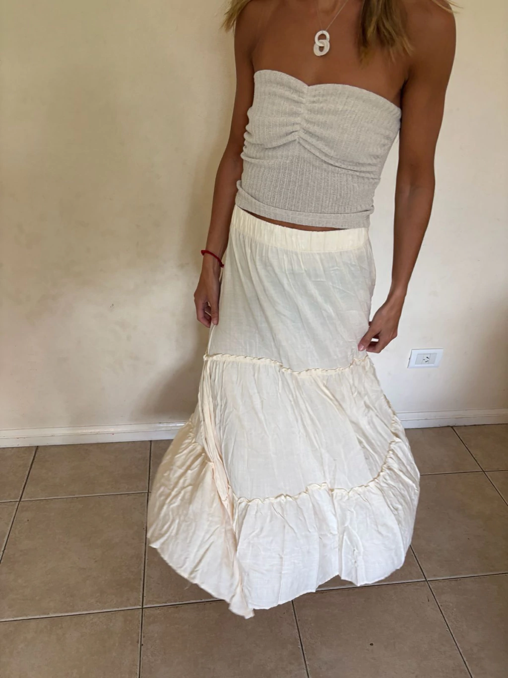 Falda larga con corte estilo campana y delicados semi volados que aportan movimiento y fluidez. Confeccionada en una tela liviana y con caída natural, combina comodidad y elegancia en una prenda versátil. Ideal para lograr un look femenino y sofisticado, tanto para el día como para la noche. Perfecta para usar con tops ajustados o camisas livianas.